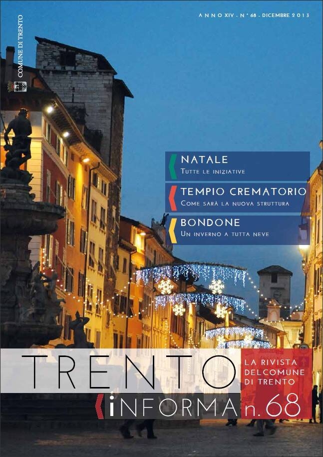 In questo numero troverai: Anche Trento avrà un tempio crematorio; Gli uffici tecnici comunali all’ex casa di riposo di via S. Giovanni Bosco; Cimiteri di Trento: sul sito del Comune si può cercare la tomba del proprio caro; Notizie dal Consiglio comunale; Trento tra le città più verdi d’Italia; Da gennaio sacchetti in distribuzione; Gioco-sport è anche sci da discesa!; Monte Bondone: un inverno a tutta neve!; Alla scoperta di Trento, città del Natale; Natalis, la tradizione del Gesù bambino in Europa.