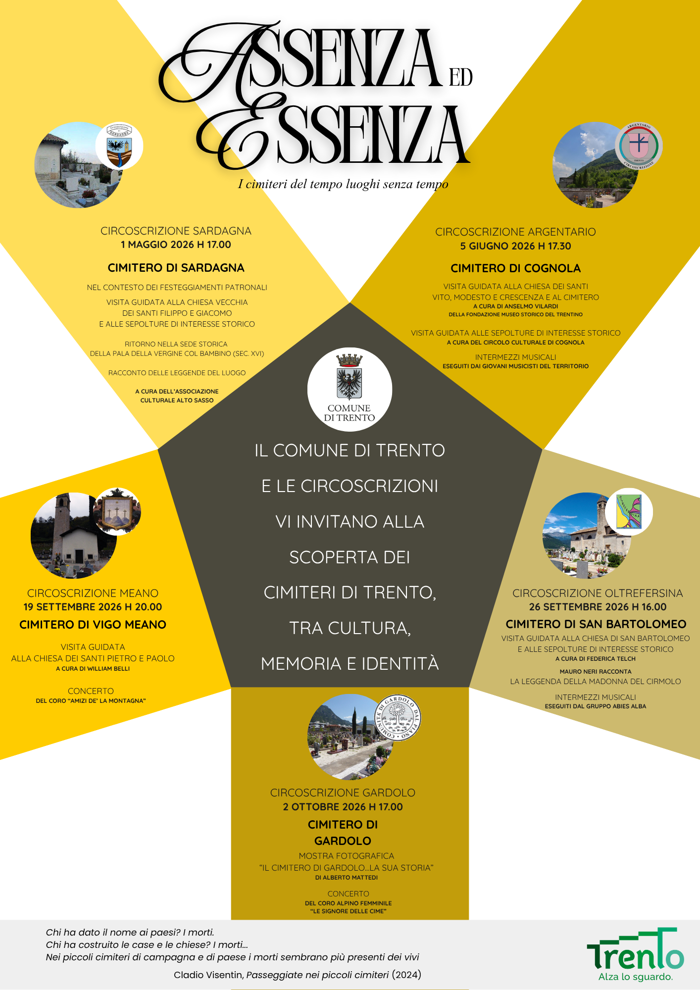 Il territorio comunale di Trento conta complessivamente 22 cimiteri, ciascuno profondamente legato alla propria comunità di riferimento. Il progetto nasce proprio dalla volontà di rinsaldare questo legame, attraverso appuntamenti che uniscono visite guidate, momenti musicali e riflessioni sul valore culturale dei piccoli cimiteri. Luoghi spesso percepiti solo nella dimensione privata del lutto, ma che possono diventare spazi condivisi, in cui la memoria individuale si trasforma in memoria collettiva.