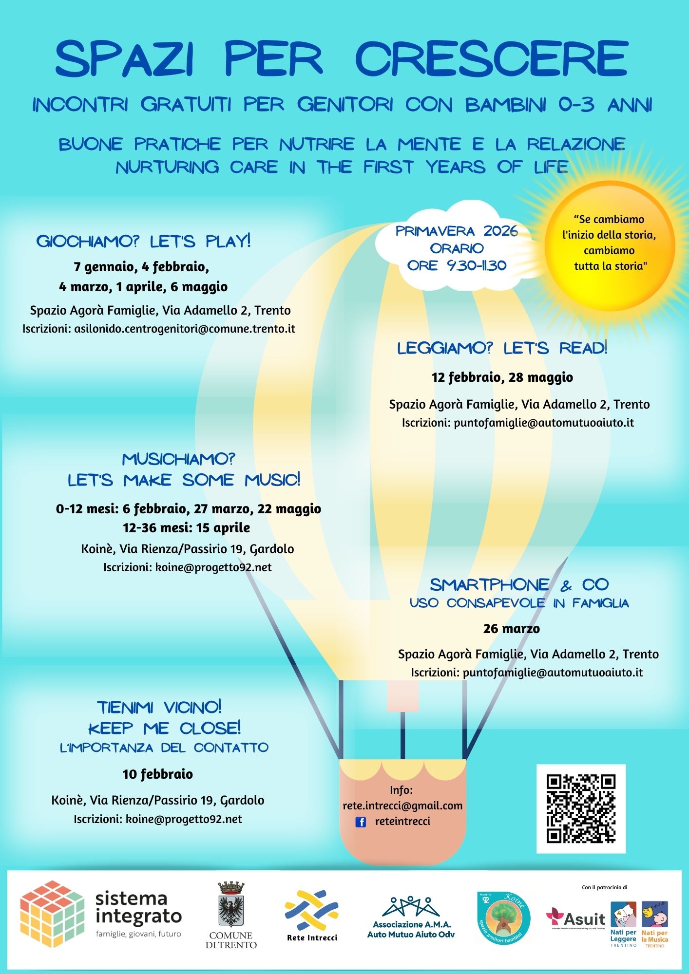 Gli incontri sono curati da Punto Famiglie – Associazione A.M.A., Koinè – Progetto 92 e Centro genitori e bambini – servizio Infanzia del Comune di Trento con il patrocinio dell’Azienda sanitaria universitaria integrata del Trentino (Asuit), Nati per Leggere e Nati per la Musica.