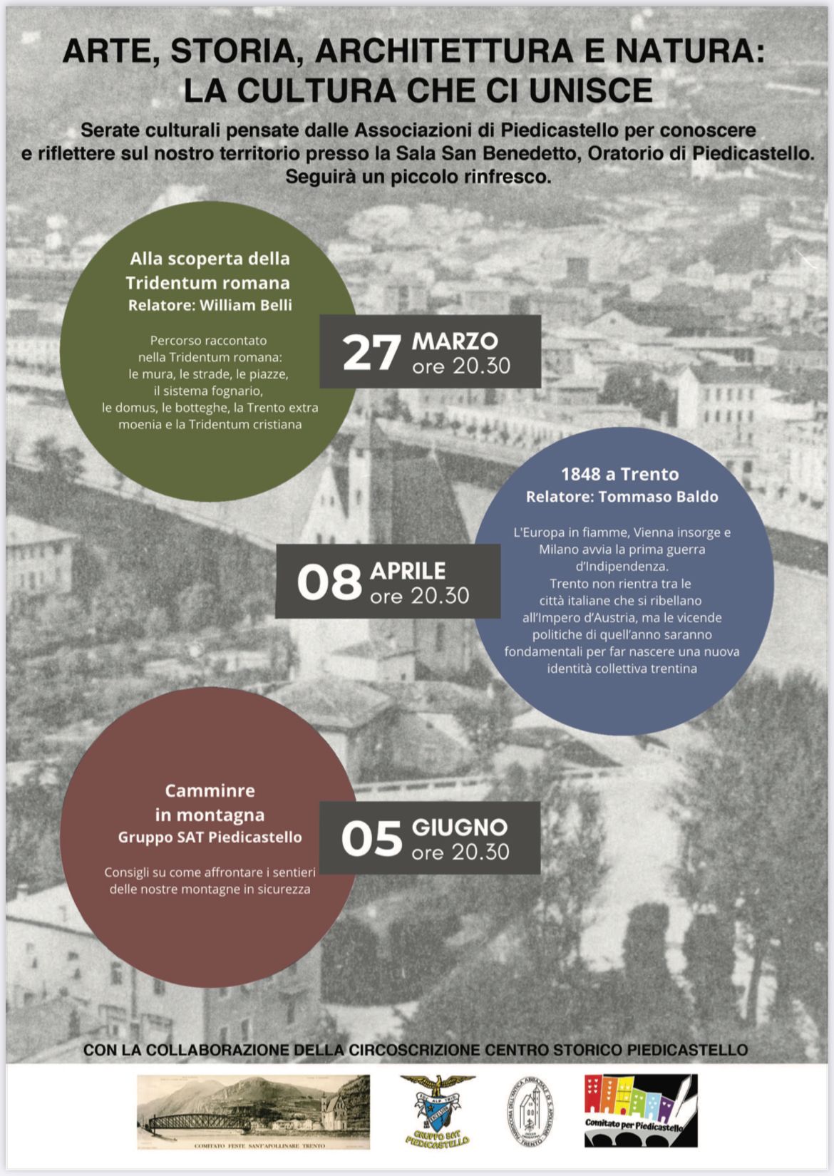 Serate culturali pensate dalle associazioni di Piedicastello, con la collaborazione della Circoscrizione Centro storico Piedicastello, per conoscere e riflettere sul nostro territorio presso la Sala San Benedetto, oratorio di Piedicastello.