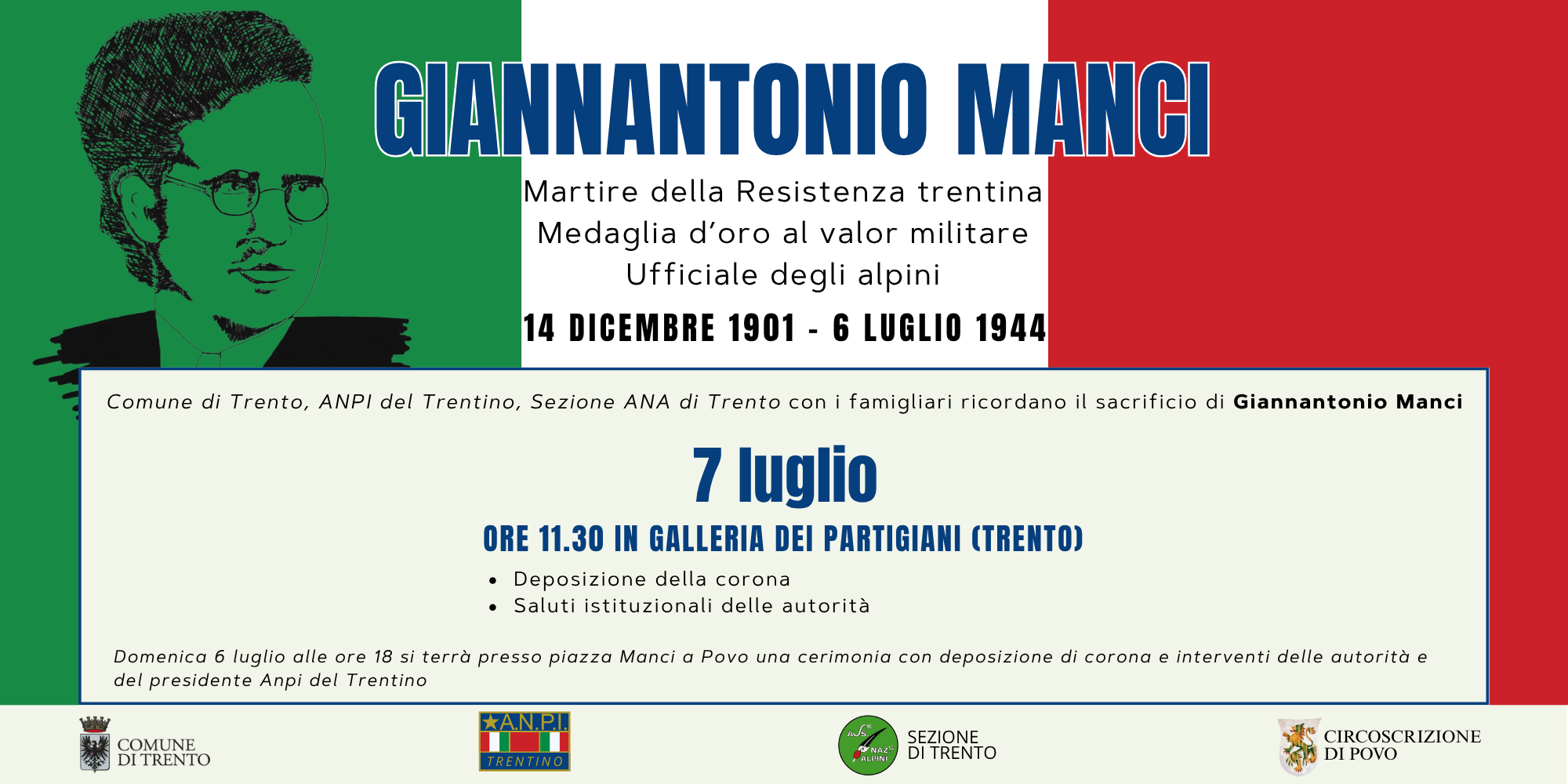 Il Comune di Trento, l'Anpi del Trentino e la Sezione Ana di Trento con i famigliari ricordano il sacrificio di Giannantonio Manci (Trento, 14 dicembre 1901 - Bolzano, 6 luglio 1944) medaglia d’oro al valore militare della resistenza italiana, martire della resistenza trentina e ufficiale degli alpini.